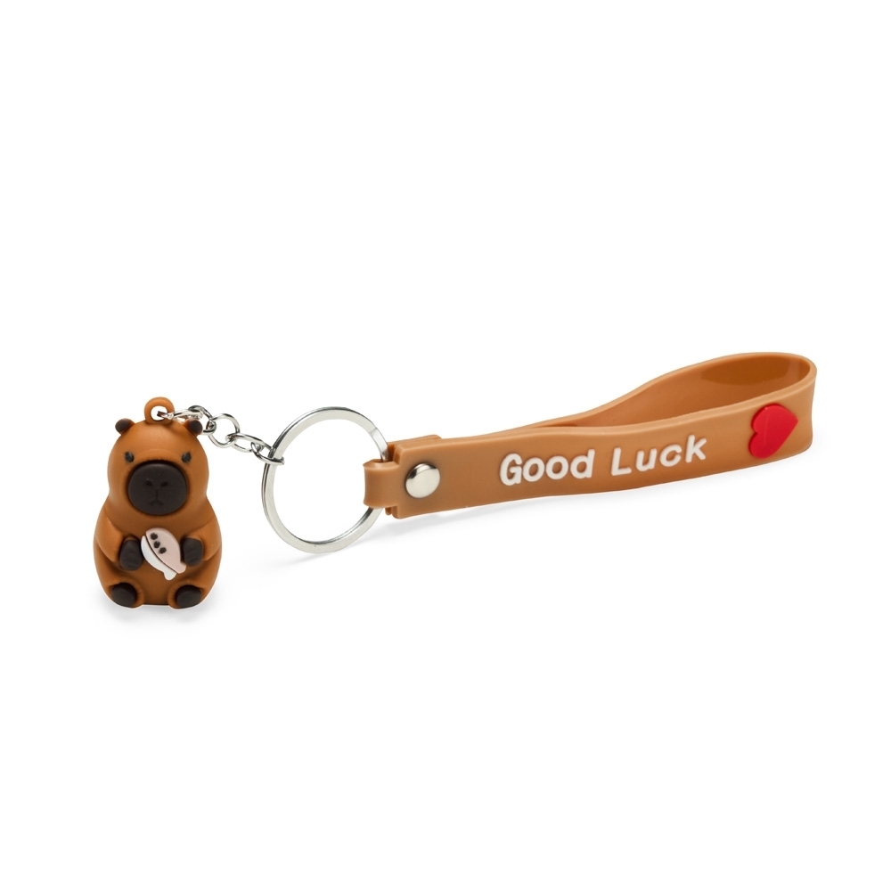 Descrição: Chaveiro com textura emborrachada e em formato de capivara, acompanhado de argola metálica e correia plástica flexível. Altura : 21 cm Largura : 3 cm Espessura : 3 cm Medidas aproximadas para gravação (CxL): 1 cm x 8 cm Peso aproximado (g): 22