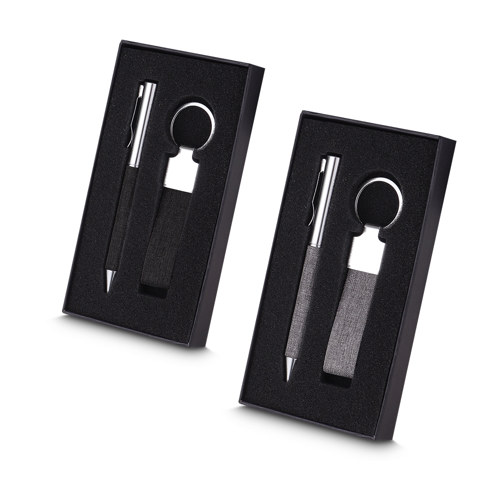 Kit Escritório, contendo: 1 Chaveiro em metal com detalhe em RPET reciclável;1 Caneta Metálica com detalhe em RPET reciclável. Acompanha berço com espuma.