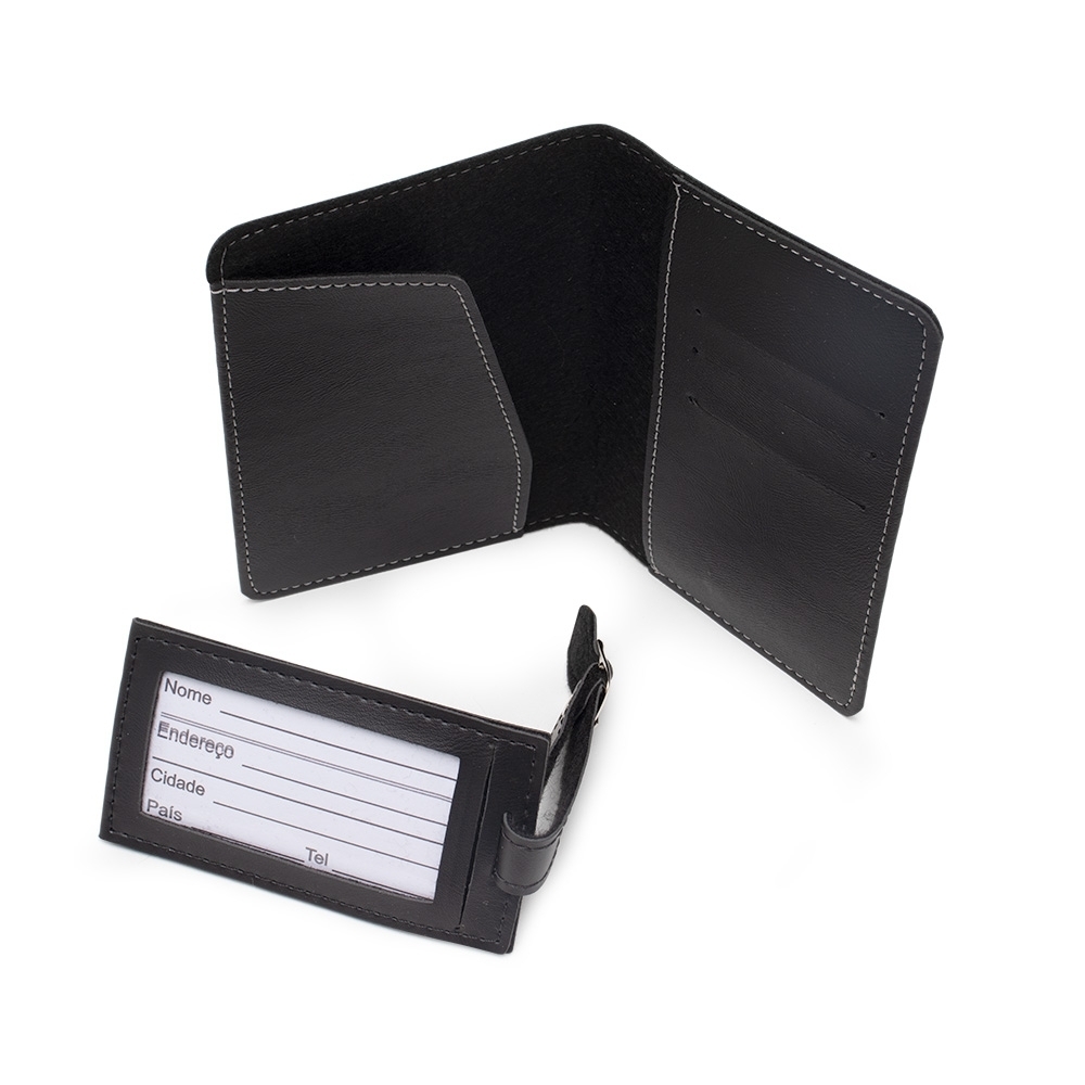 Descrição: Kit Viagem 2 peças Bidins em couro sintético. Possui porta passaporte Porta com três divisórias para cartões e identificador de bagagem com fivela ajustável. Altura : 14 cm Largura : 9,8 cm Medidas aproximadas para gravação (CxL): 12,5 cm x 8 cm Tamanho total aproximado (CxL): Carteira aberta: 14 cm x 20,1 cm Peso aproximado (g): 54 VOLTAR
